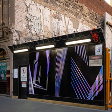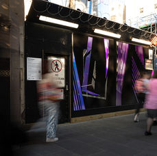 These hoarding artworks Wall Whispers, displayed on the Metro Tunnel Town Hall construction site, Swantson Street, Melbourne, feature a series of B&W photographs of Meagan's original light installation Sky Whispers, first show at the National Gallery of Victoria in 2023. The photographs have been embellished with iridescent reflective vinyl tape.